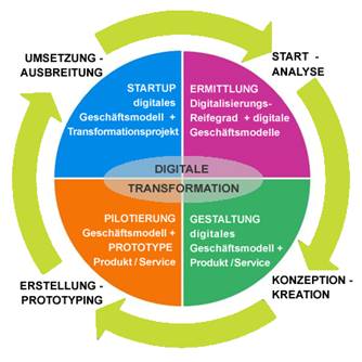 WORKSHOPS• The company's degree of digital maturity is determined using a qualified method and the findings are used to identify the digitization potential for new business models. • The design of the new business model and the creation of the associated prototype (product or service) are designed using proven methods. The prototype should contain the minimum requirements of the product or service to be developed. • The business model and the associated prototype are checked and evaluated for marketability and customer acceptance. • The project start of the new digital business model is then set up for implementation. With the experience gained, the necessary structures for implementation and dissemination are set up. |